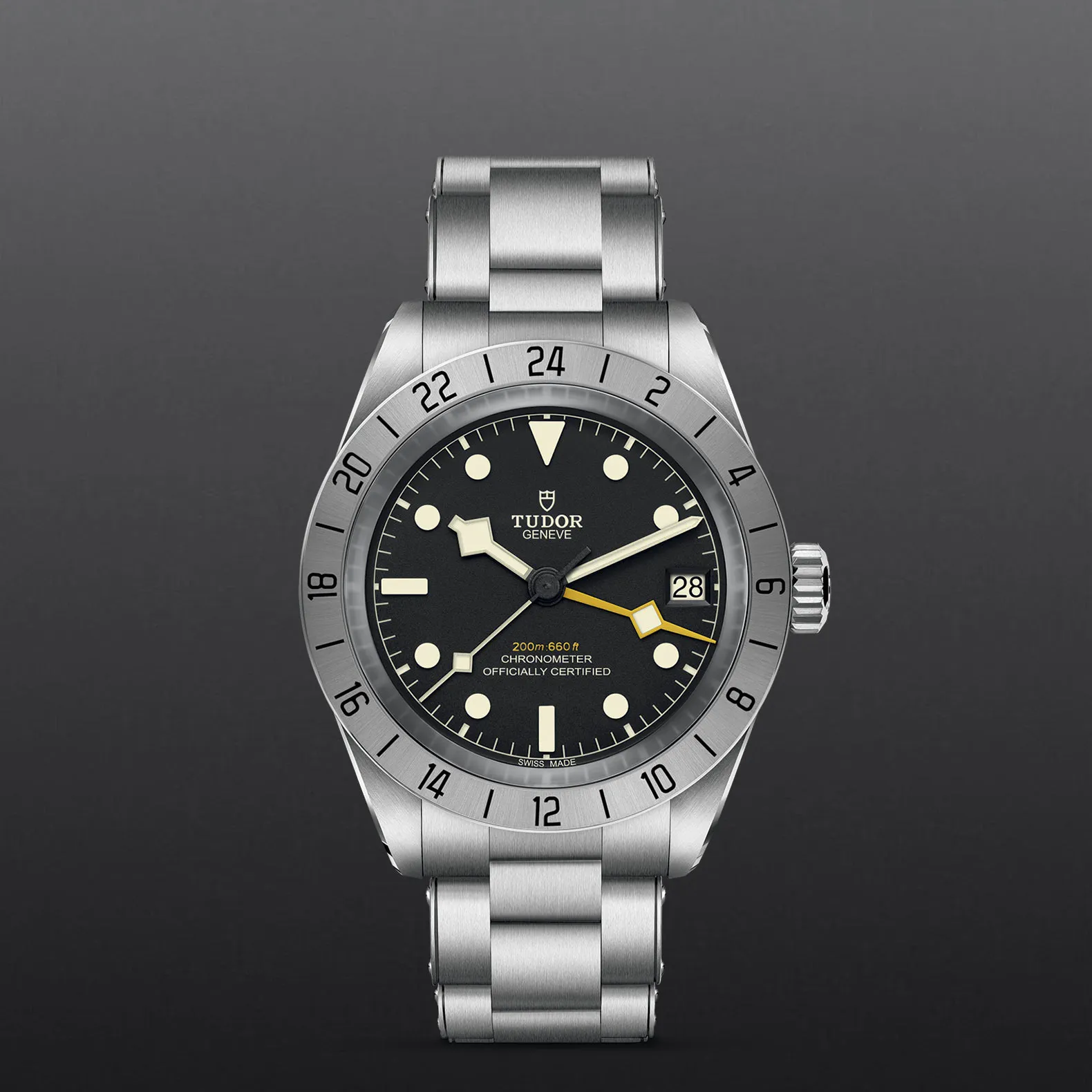 Il Black Bay Pro è un modello interamente nuovo dotato di doppio fuso orario, una complicazione tecnica che permette di visualizzare l’ora locale senza perdere di vista l’ora di un altro fuso orario. Compatto, robusto e sportivo, questo modello presenta numerosi dettagli estetici unici e celebra lo spirito degli orologi tecnici che TUDOR ha prodotto per i professionisti nel corso della sua storia. Riconoscibile grazie alla lunetta fissa satinata graduata 24 ore e alla lancetta “Snowflake” 24 ore di colore giallo, il Black Bay Pro è animato dal Calibro di Manifattura TUDOR MT5652 con funzione GMT integrata.